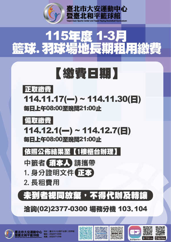 【場地抽籤公告】115年度 籃球&羽球場地 長期租用抽籤結果&繳費辦法
