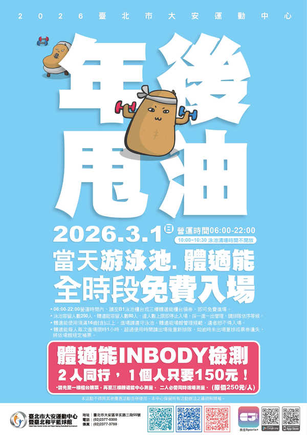 【免費】2026.3/1(日)年後甩油-泳池體適能免費!INBODY檢測兩人同行超優惠!