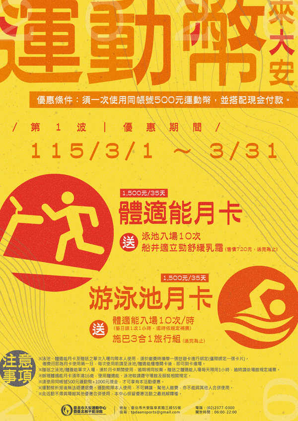 • 運動幣折抵後無法退還退費。運動幣限本人使用,不可轉讓、幫他人繳費,亦不能與其他人合併使用。