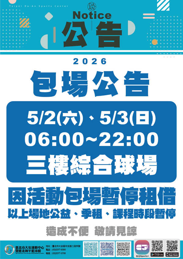 • 體適能須滿16歲(含)以上方可入場,進場請遵守泳池、體適能場館管理規範,違者恕不得入場。