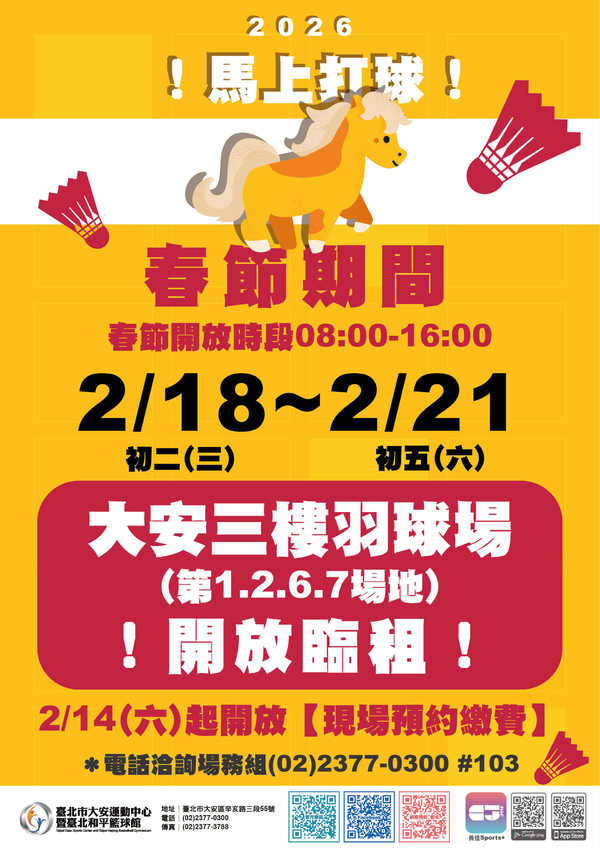 【優惠】2026春節 大安羽球開放臨租&和平暖身籃球場優惠