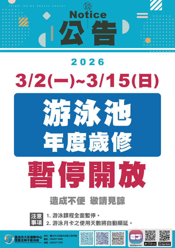 ※體適能使用須滿16歲(含)以上,進場請遵守泳池、體適能場館管理規範,違者恕不得入場。