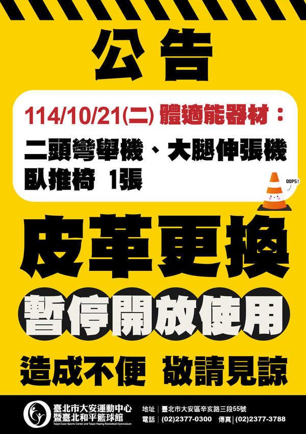 【體適能器材暫停公告】114/10/21(二) 體適能部分器材進行皮革更換,暫停開放