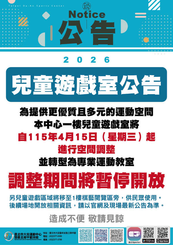 【公告】兒童遊戲室 115/4/15起暫停開放