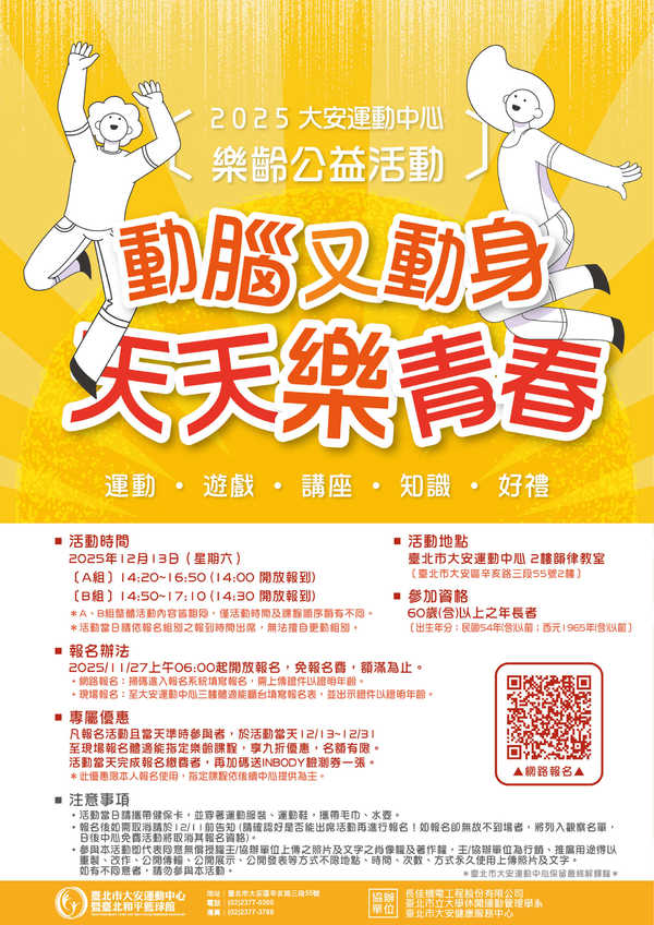 【免費活動】2025.12/13(六)大安運動中心「動腦又動身 天天樂青春」樂齡公益活動