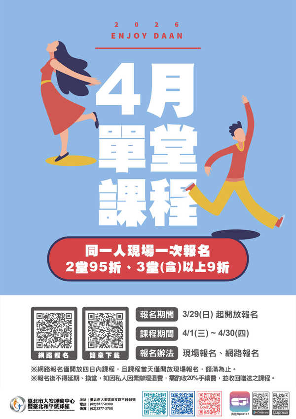 【課程】115-2期 4月單堂課程,同一人現場一次報名2堂95折、3堂(含)以上9折